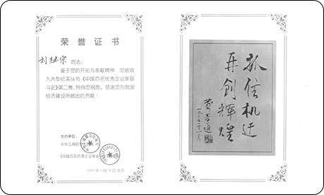 1997年3月,劉繼宗董事長(zhǎng)被邀請(qǐng)參加“全國(guó)百名優(yōu)秀企業(yè)家大會(huì)”,業(yè)績(jī)被收入大型紀(jì)實(shí)叢書(shū)《中國(guó)百名優(yōu)秀企業(yè)家?jiàn)^斗史》第二卷